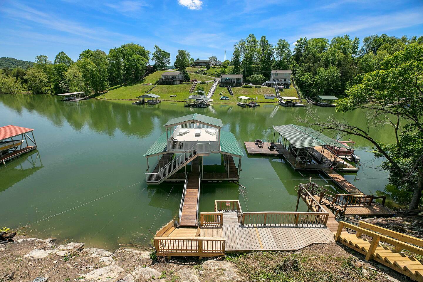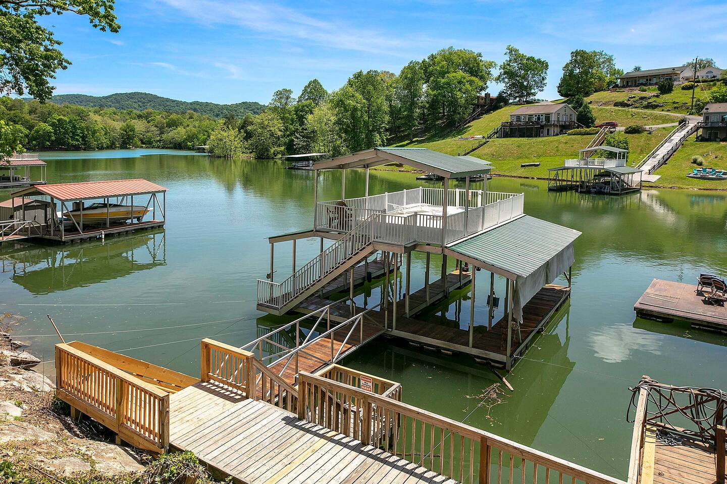 -We have multiple pontoon rentals available upon request. You must have a valid boaters license or be born before 1989 to operate. Please note we deliver the boat to the property & the boat can be taken out anytime during your stay, just note per our insurance, the boats are not to be taken out after dark. All Bookings must be made a week in advance to guarantee delivery. All boats must be returned with a full tank of gas to avoid additional charges. Please note we do not rent tubes but local marinas do & the boat is to be returned to the house after the rental period is over. Rates are as follows: Pontoon rental - $325 per day plus taxes & $50 insurance & taxes. -There are also kayaks included with the rental close to the dock. Please note that we do not provide life jackets. Please be sure to return to the kayak rack at the property once finished! -The home is located at the end of Dodson Creek Cove right past Bubba Brews & Beach Island Marina on Jesse Rd! -The home is equipped with a spacious kitchen equipped with a standard coffee maker, dishwasher, fridge, stove, microwave & much more! The home also includes a hot tub, ping pong table, foosball, pool table, weber gas grill with propane on site that we provide, Fiber WIFI, & Samsung Smart TV’s throughout the entire house as well as a double deck overlooking Norris Lake! -There is a private dock with a swim ladder! One boat is allowed per house. Our pontoon rental stays in the other slip! -It is not allowed to leave your trailer at the property & is highly recommended to launch prior to going to the property. The road is short but is a single lane and is tight & peaks & valleys in spots which would make turning around with a trailer difficult. We however do provide several options. There’s an additional property we own 2 minutes away that can be dropped at in the field beside the house or we have a gated warehouse less then 10 minutes away that it can be left at for the duration of your stay. Just please be sure to let us know which option you prefer as it gets closer. You can put in at Beach Island Marina (5 mins away)! -Please note, this part of the lake has year round water. Just please be advised that lake levels are lowered by the TVA in the Fall and raised again in the Spring & can fluctuate in off season months.