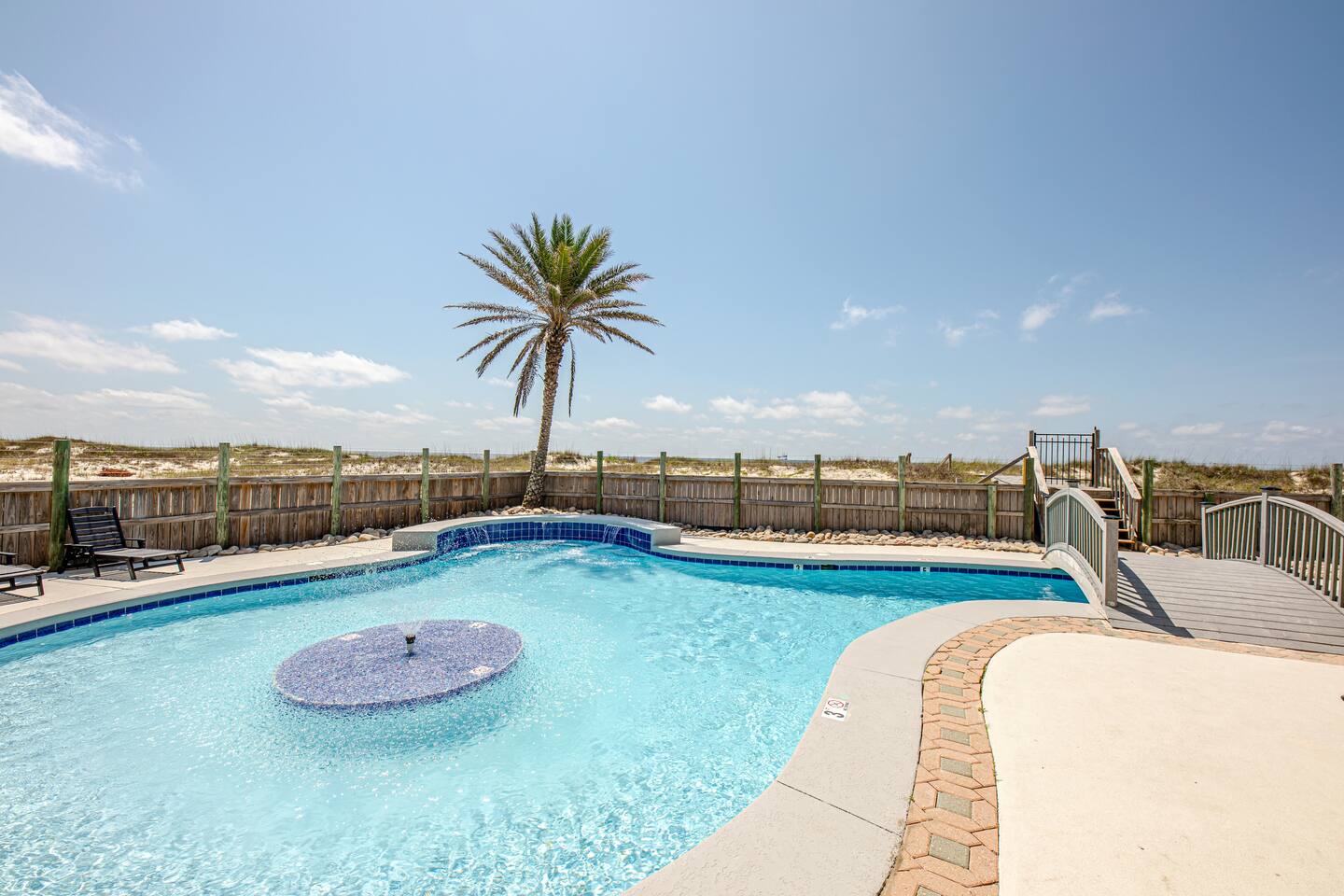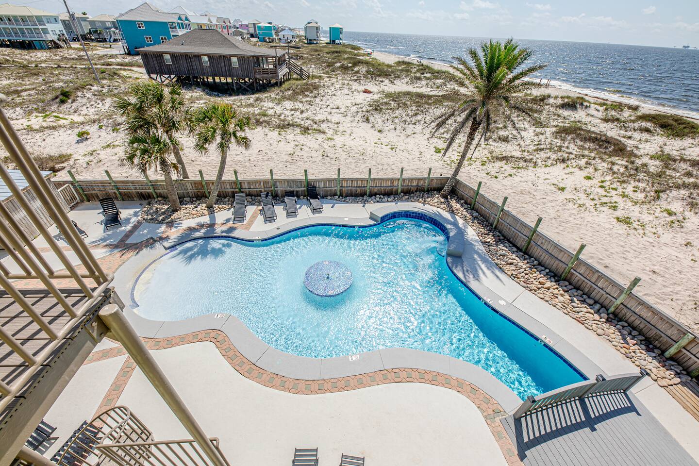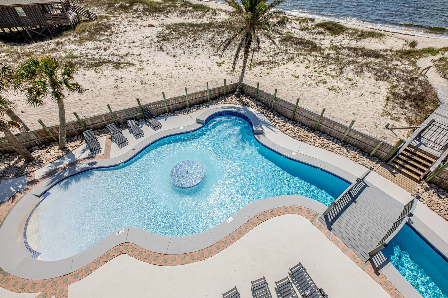 Located two miles from historic Fort Morgan this upscale and elegant dual duplex sits on sugar white beaches with a panoramic view of the Gulf of Mexico. Relax and enjoy the Gulf of Mexico from your covered balcony. Swim in the designer pool or sit under one of the pool's waterfalls. Watch the kids from the covered patio / observation area 5 steps from the pool. Or take the bridge over the pool to the beach or take a dip in the Gulf. It is a walk of less than two minutes on your boardwalk.