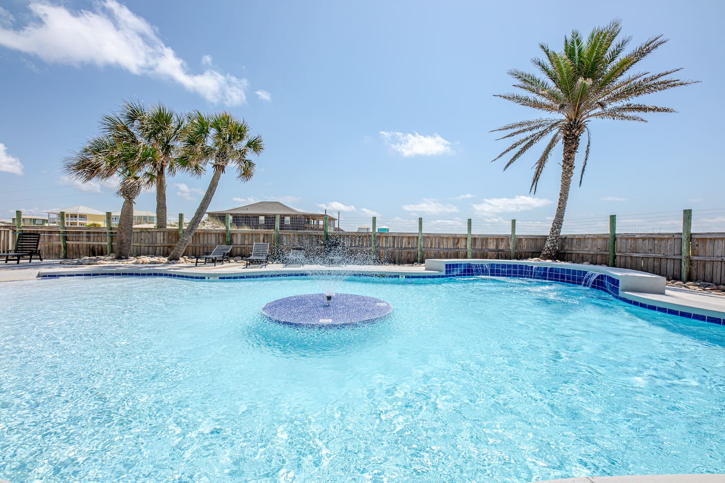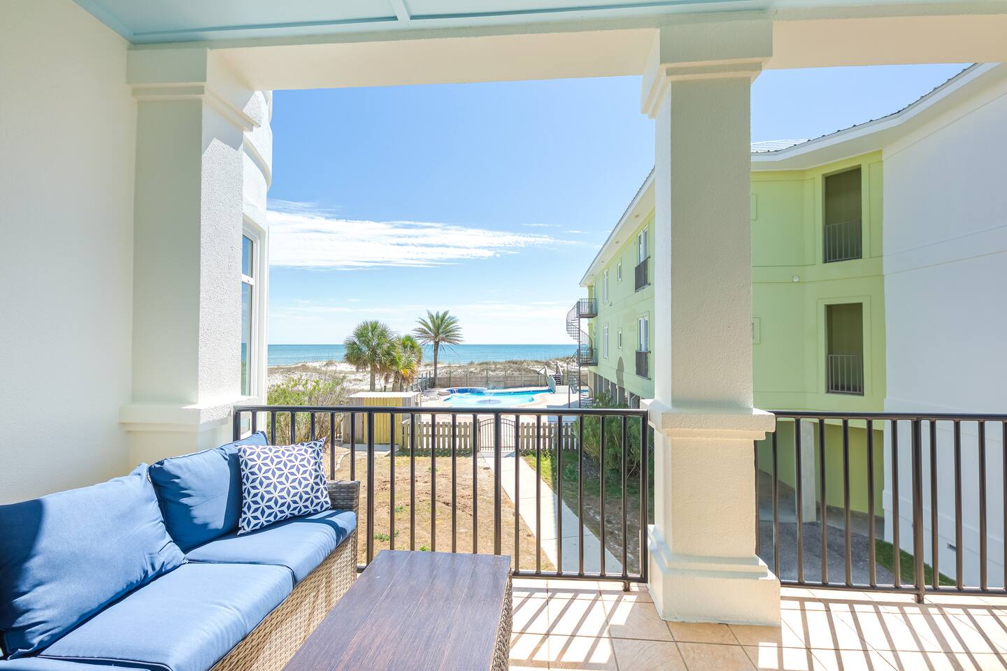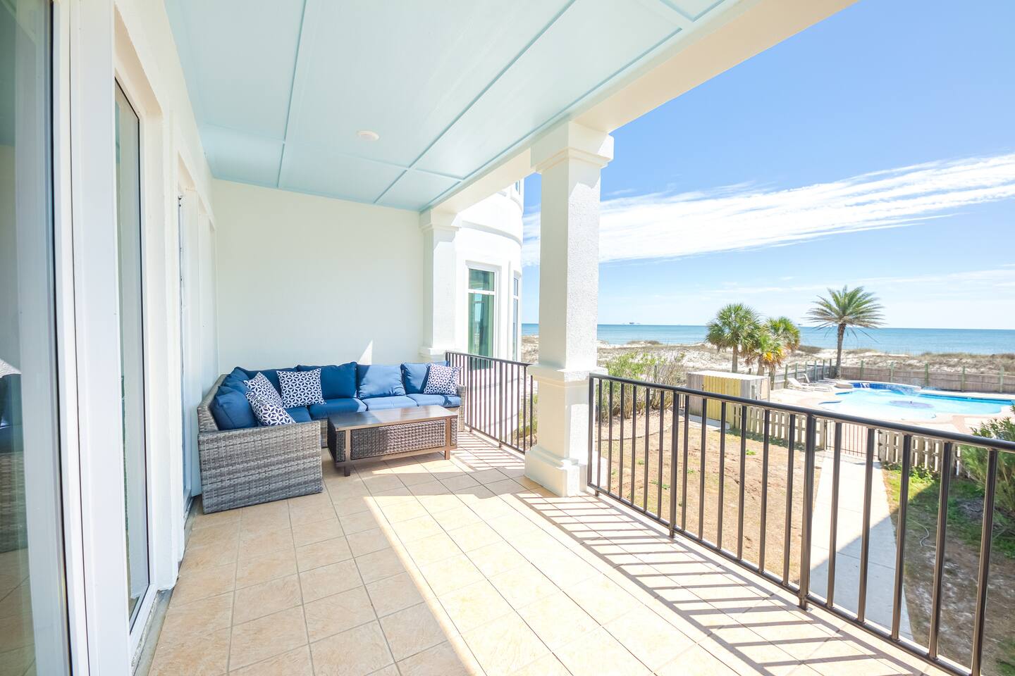 Located two miles from historic Fort Morgan this upscale and elegant dual duplex sits on sugar white beaches with a panoramic view of the Gulf of Mexico. Relax and enjoy the Gulf of Mexico from your covered balcony. Swim in the designer pool or sit under one of the pool's waterfalls. Watch the kids from the covered patio / observation area 5 steps from the pool. Or take the bridge over the pool to the beach or take a dip in the Gulf. It is a walk of less than two minutes on your boardwalk.