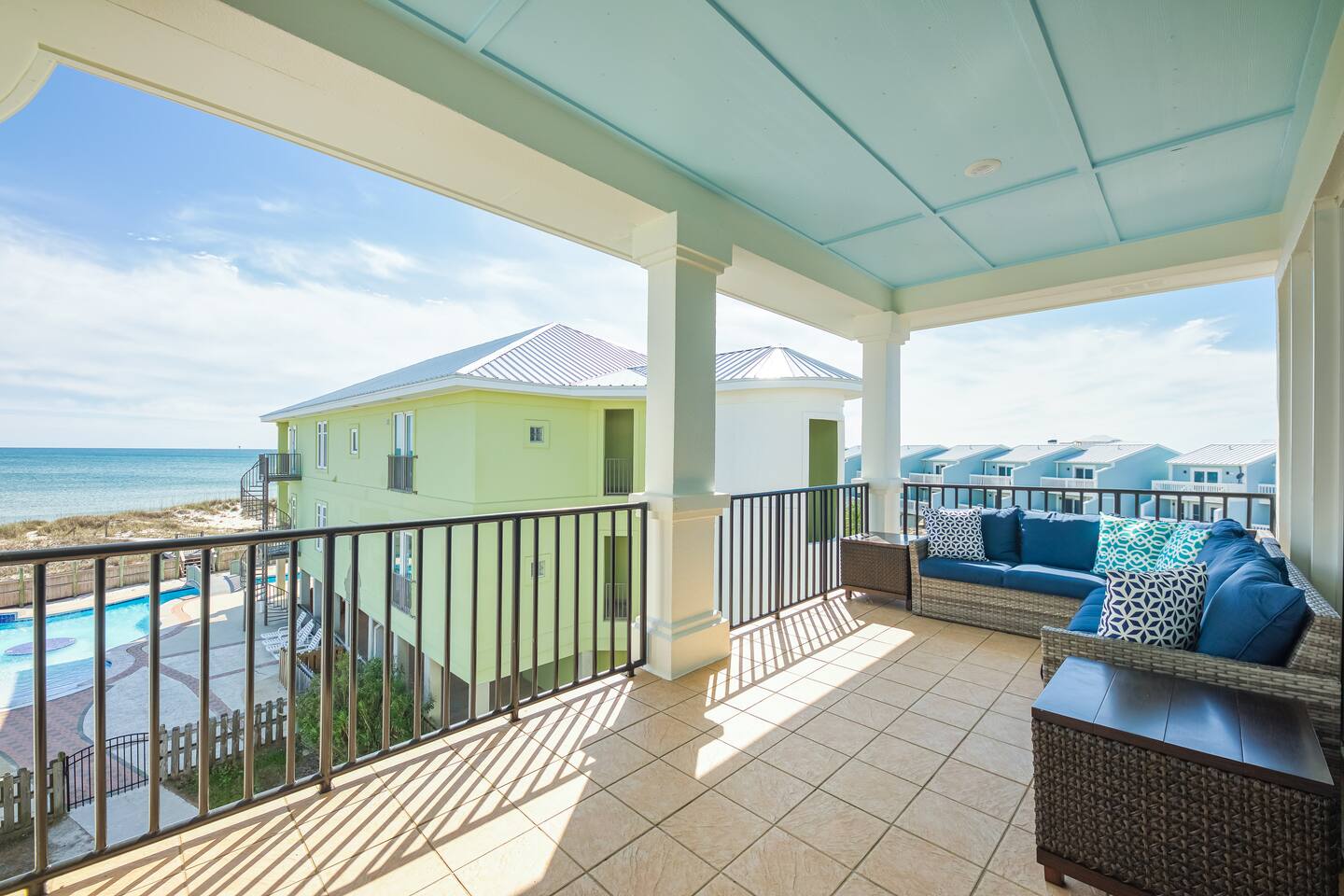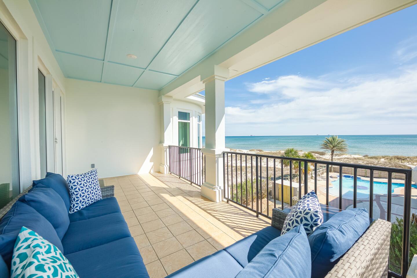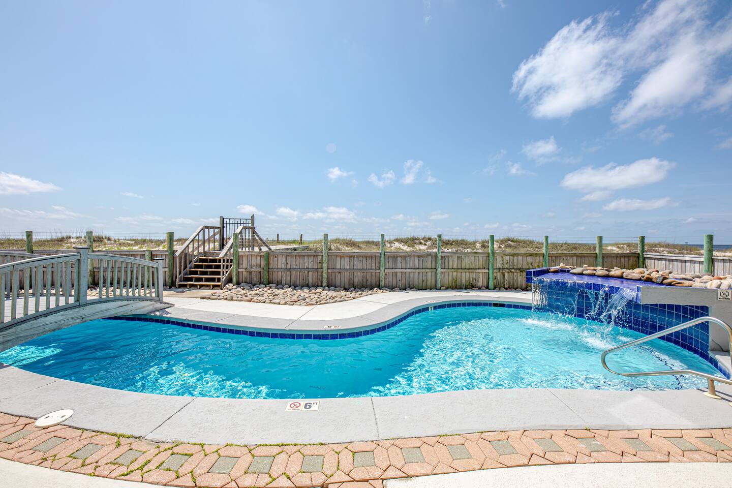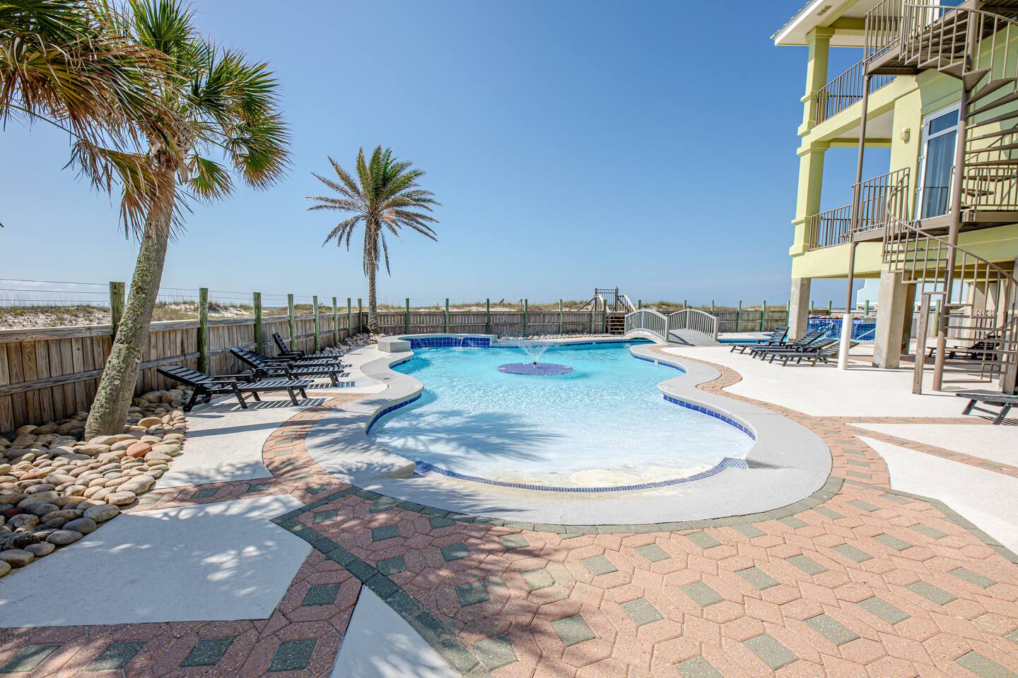 Located two miles from historic Fort Morgan this upscale and elegant dual duplex sits on sugar white beaches with a panoramic view of the Gulf of Mexico. Relax and enjoy the Gulf of Mexico from your covered balcony. Swim in the designer pool or sit under one of the pool's waterfalls. Watch the kids from the covered patio / observation area 5 steps from the pool. Or take the bridge over the pool to the beach or take a dip in the Gulf. It is a walk of less than two minutes on your boardwalk.
