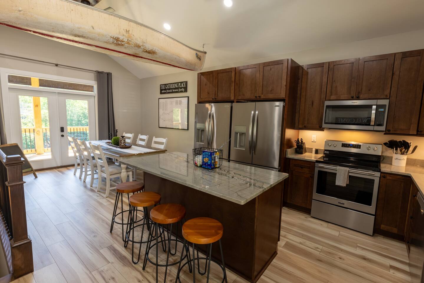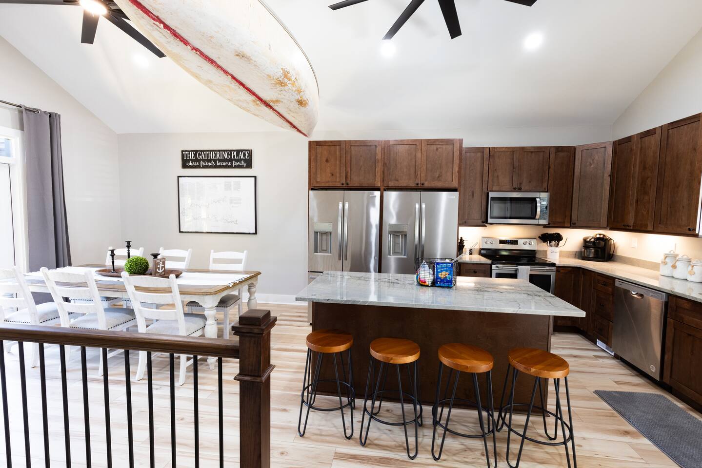 -We have multiple pontoon rentals available upon request. You must have a valid boaters license or be born before 1989 to operate. Please note we deliver the boat to the property & the boat can be taken out anytime during your stay, just note per our insurance, the boats are not to be taken out after dark. All Bookings must be made a week in advance to guarantee delivery. All boats must be returned with a full tank of gas to avoid additional charges. Please note we do not rent tubes but local marinas do & the boat is to be returned to the house after the rental period is over. Rates are as follows: Pontoon rental - $325 per day plus taxes & $50 insurance & taxes. -There are also kayaks included with the rental close to the dock. Please note that we do not provide life jackets. Please be sure to return to the kayak rack at the property once finished! -The home is located at the end of Dodson Creek Cove right past Bubba Brews & Beach Island Marina on Jesse Rd! Please note this property has a short steep driveway and it is recommended to back down. There is additional parking at the top. -The home is equipped with a spacious kitchen equipped with a keurig duo coffee maker, 2 dishwashers, 2 large fridges, stove, over the range microwave & much more! The home also includes a hot tub, weber gas grill with propane on site that we provide, Fiber WIFI, & Samsung smart TV’s throughout the entire house pre loaded with all your favorite apps as well as a multiple decks with their own patio area! -There is a private dock! One boat is allowed per house. Our pontoon rental stays in the other slip! -It is not allowed to leave your trailer at the property & is highly recommended to launch prior to going to the property. The road is short but is a single lane and is tight & peaks & valleys in spots which would make turning around with a trailer difficult. We however do provide several options. There’s an additional property we own 2 minutes away that it can be dropped at in the field beside the house or we have a gated warehouse less then 10 minutes away that it can be left at for the duration of your stay. Just please be sure to let us know which option you prefer as it gets closer. You can put in at Beach Island Marina (5 mins away)! -Please note, this part of the lake has year around water. Just please be advised that lake levels are lowered by the TVA in the Fall and raised again in the Spring & can fluctuate in off season months.